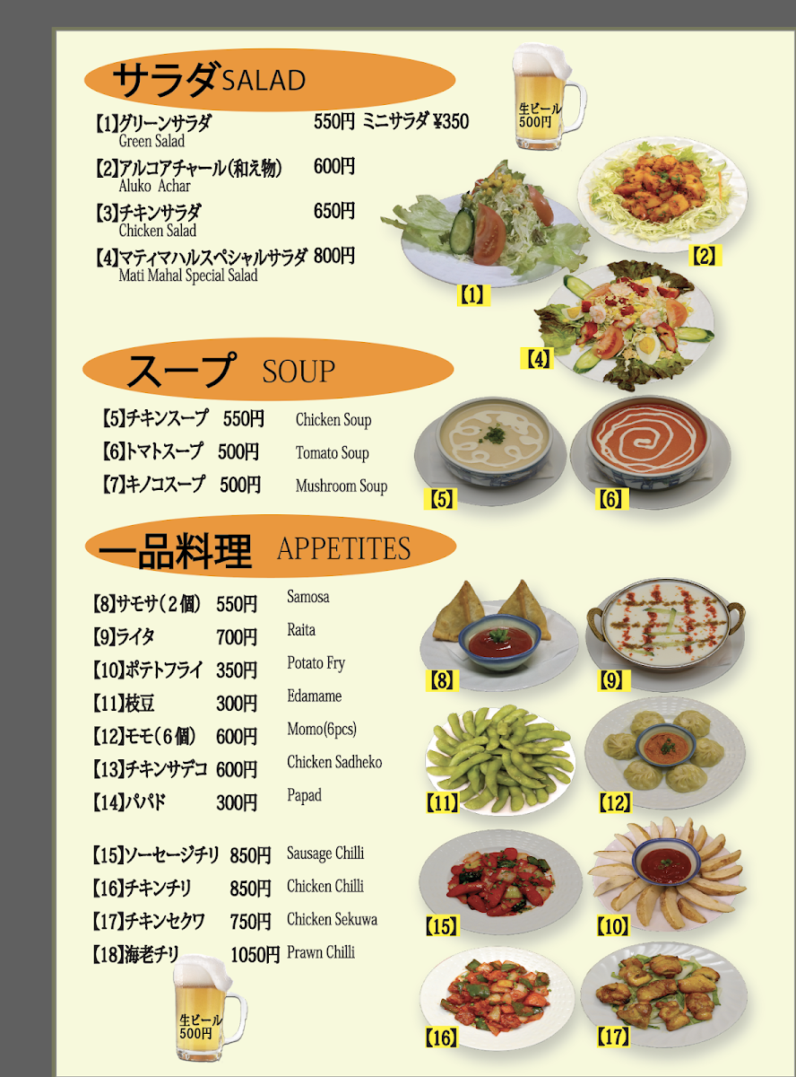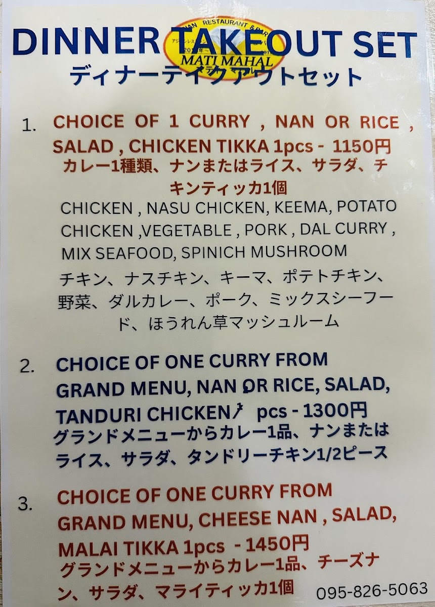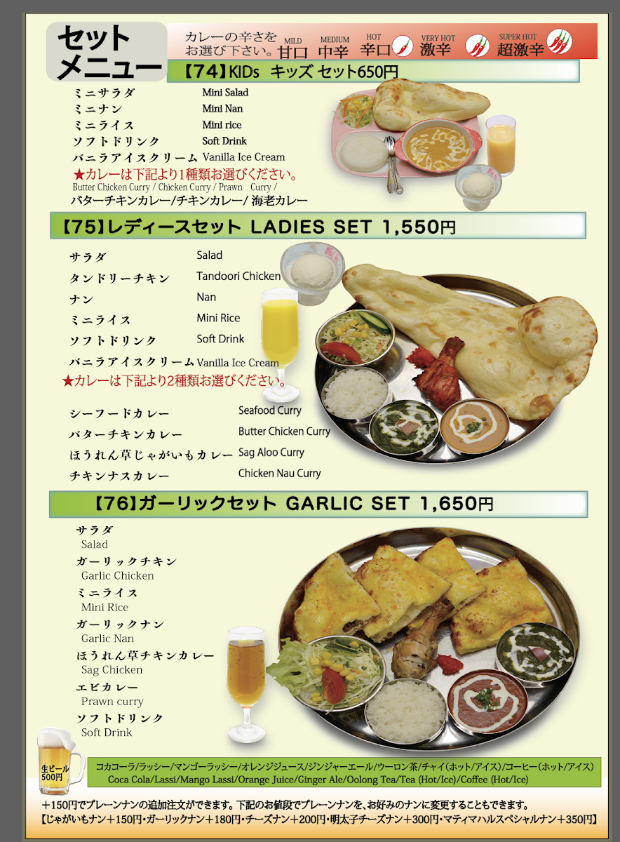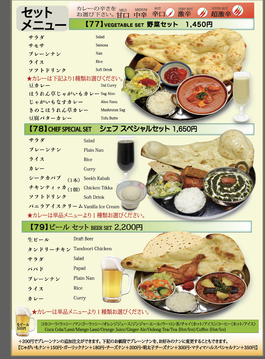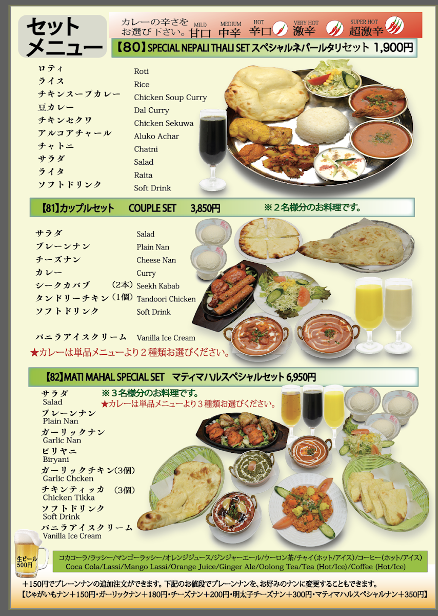 In summary, Matimahal Indian Restaurant offers a comprehensive menu that combines the best of Indian and Nepalese cuisine, with a variety of sets, snacks, and drinks to suit different preferences and occasions. Whether you're visiting for lunch or dinner, you'll find a satisfying meal that brings a taste of India and Nepal to Nagasaki.